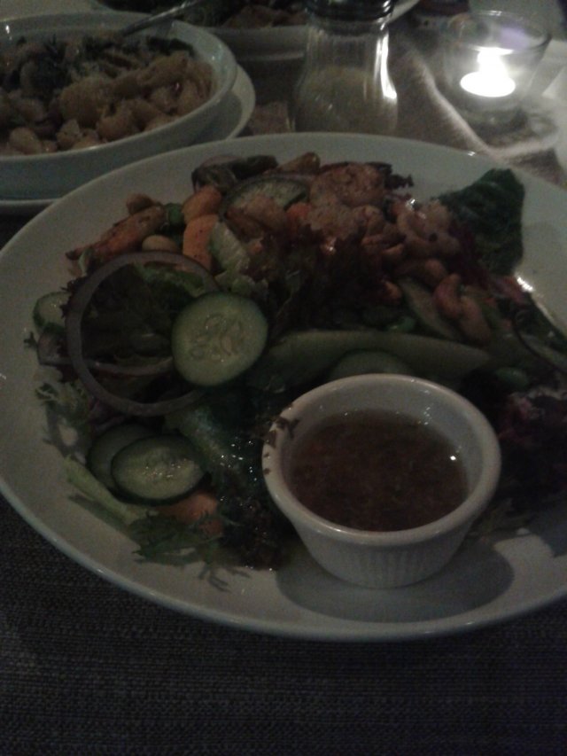 他们家盆子大是出了名的的,偏偏桌子又特别小,两个色拉一上桌就占满了。我的木瓜鲜虾色拉还是很给力的,貌似这是我第二次点它了,里头有不少新鲜的大虾,一块块小木瓜蛮甜的说,还有各类绿叶蔬菜、黄瓜片什么的,拌上酸酸甜甜的dressing,味道真心不错啊!