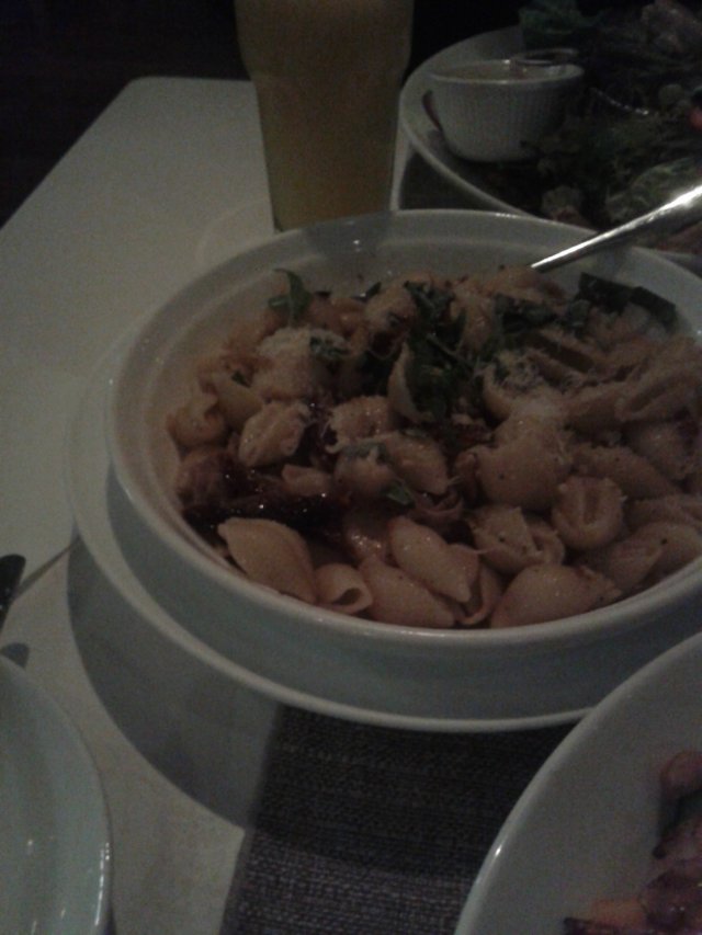 澳带培根贝壳面,服务员端上来的时候,桌子上都快放不下了,我们两盘色拉在那里挪了几下,才好不容易腾出个空地儿给它。这面里头有大颗的澳洲带子和培根肉,贝壳面里头的奶油味也很足,管饱啊!那个带子很嫩的口感,培根事先煎锅,肥腻都走掉了,咸咸香香的,我喜欢!