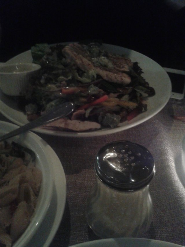 同事的凯撒色拉加鸡胸肉,他们家色拉都可以另外在上面加料的,像鸡胸肉啊、三文鱼排啊神马的。尝了一口鸡胸肉,觉得肉质有点柴啊,不是那种有点汁水的嫩嫩鸡肉,所以我觉得味道一般啦,凯撒色拉的配料都很新鲜,菜叶子脆嘣嘣的!
