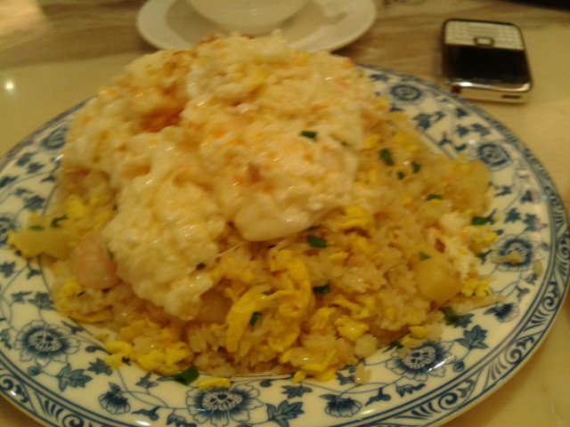 澳门小姐炒饭,38元,这个还特别推荐,真搞不懂有什么好的,上面堆了一层炒蛋清,量倒是不小,不过就是很普通的炒饭嘛,可能多放了几块菠萝,但是这饭让我在家里做,做得也不比他们差。