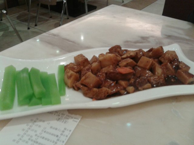 雪花牛肉拼清炒芦笋,52元,这道菜太坑爹了,牛肉老得要命,竟然还好意思称是雪花牛肉,不过里头统共没几块牛肉,都是些菌菇。而且拼的也不是清炒芦笋,是水里串了一下的莴笋,一点味道都没有的。