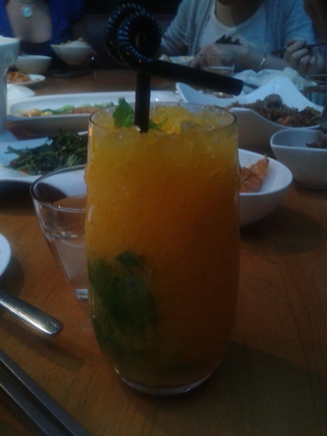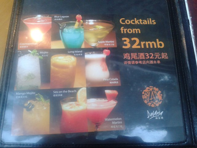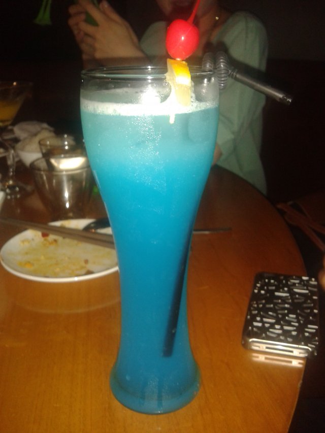 现在晚市鸡尾酒买一送一,同事里头好几个老外,嗜酒如命,没办法大家一起喝了。我点了芒果玛吉托,我的个天啊,里头超多冰,液体吸都吸不到,味道倒是挺好的,不过更像芒果饮料,不像酒。尝了同事的苹果马蒂尼,这个酒味就厉害很多了。蓝色湖泊,这个颜色超好看,不过像青柠汁的味道,也没啥酒味。
