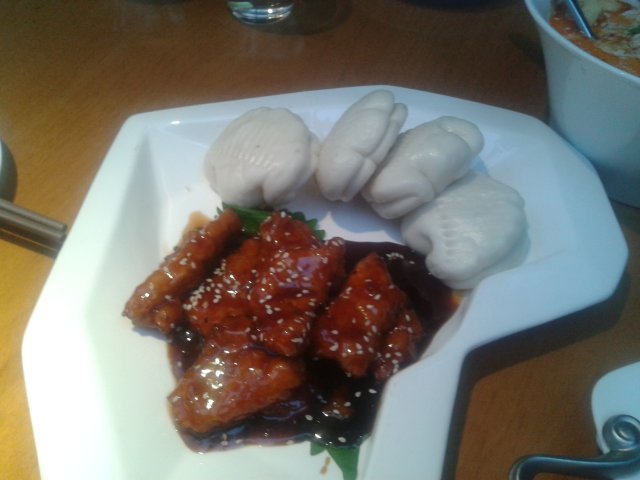 猪肉夹饼,忘了叫什么名字了,反正是烧得挺甜的猪肉排,配了四个小馒头让你夹,那个猪肉太甜了我觉得,情愿吃俺们的京酱肉丝夹饼。