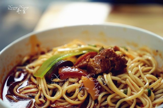 当家面叫“知味面”,15元一份,可续面。价格比其他口味高了一头,不免让人心生疑惑。老板解释说,知味面就是拥有各种浇头的满汉全席。于是就想到了熊姐家的“豪华面”。这知味面可比豪华面的价格低了不少,所以为老爷叫了一份。承装的海碗还没有被端上桌,就有点让我们诧异,分量确实不小!老爷自知食力不够,连声说,“能把这碗吃完就差不多了。”果然是各种浇头的济济一堂——肉臊、烧肉、排骨、杂酱、豌豆等等。面里配的蔬菜是莴笋片,这一点非常罕见!面条是成都常见的棍子面,个人很喜欢。面条的火候到位,在各种浇头混杂的红汤里,很是入味,再加上莴笋片,又增加了一层爽脆!可惜红烧肉确实有些肥,而且烧得很耙软,属于一入口,就会让人有咬了一包油的错觉之魔力。这一点稍显遗憾。