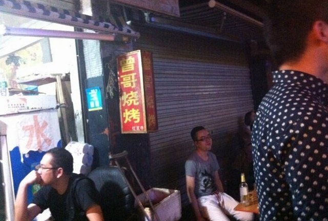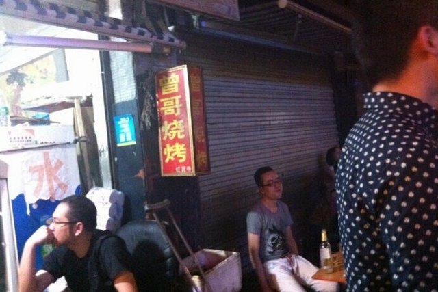 回想第一次去,听朋友说曾哥烧烤多么多么的好吃,然后慕名而去。就在红瓦寺一个小巷子里,七天连锁酒店的对面,你看不见它的招牌,无所谓。你只要看见七天连锁酒店门口坐起一堆人,那你就走对了。店面的招牌是卖刀削面的,曾哥烧烤的牌子很小,根本不起眼。不过门口摆了一个烧烤摊子,地方还是很好找的。