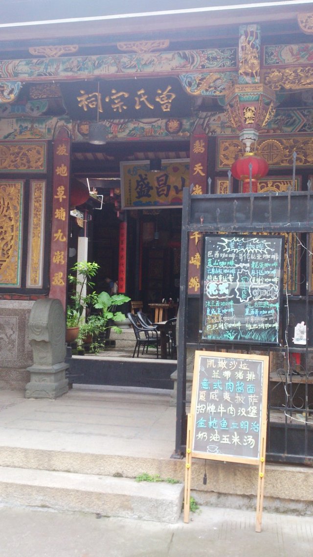曾氏宗祠咖啡 月神侠等級32013-12-1213 瀏覽 關注 位于曾厝垵,开在宗祠里面的咖啡馆,还起个英文名叫Temple Cafe。不知道老板是怎么有这种勇气开的,创意是有,可这不知道是不是你家的宗祠还是租来的,满堂的神佛陪着你喝咖啡,这感觉…… 位置不大,摆满了牌位跟神佛外就几张桌子。有咖啡、有意面、有披萨、有牛排、有三明治、还有酒,价格都不低,没办法,曾厝垵这里游客多嘛,能宰一刀是一刀。 不知道他们家祭奠的时候是不是供咖啡的…… 阿弥陀佛,施主还是还祖先一个宁静吧!以上食評乃用戶個人意見 , 並不代表OpenRice之觀點。讚好分享曾氏宗祠咖啡 曾氏宗祠咖啡 https://s.openrice.com/KtbT400CUO800檢舉 張貼 評分3味道3環境3服務3衛生3抵食人均消費¥40 (晚餐)