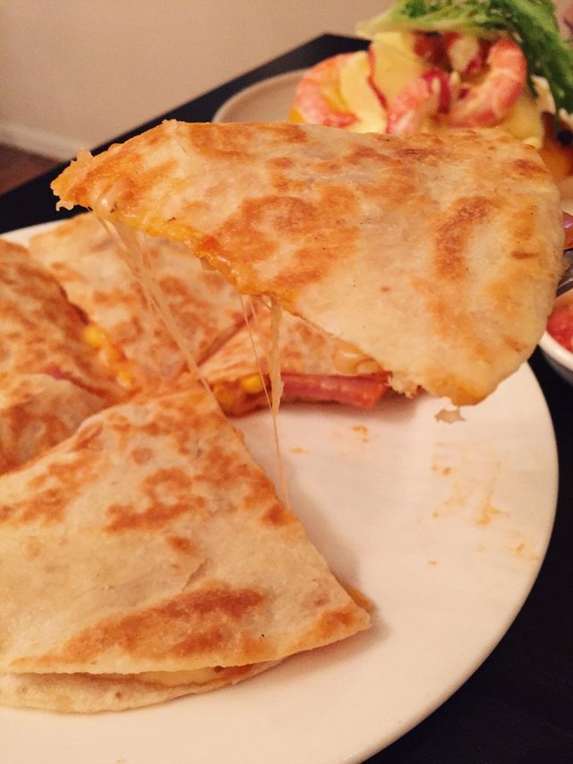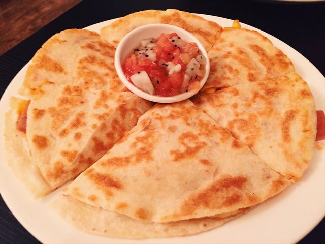 重奶酪火腿甜玉米馅饼,42米。吃过了牛肉鸡肉的馅饼,这次选了没尝试过的火腿玉米款。饼皮酥脆,内馅丰富,番茄口味的特别开胃,虽然是重奶酪,但多吃几块也不会觉得腻口。切成角更容易分食,还贴心的配了火龙果和西瓜的水果小碟,也是为了解腻的吧。