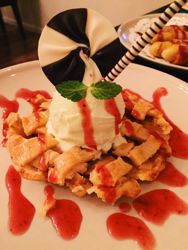 苹果派配冰淇淋,22米。随意点个甜品,这么美真的好么,哇咔咔。苹果派松软不甜腻,有果肉在里面,嚼起来香香哒。冰淇淋球作为点缀,更是满足了甜品星人的一大嗜好。