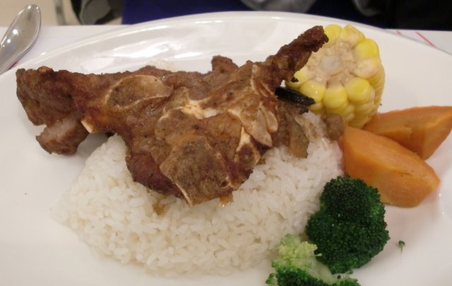 一大块猪排配一些西兰花、胡罗卜和玉米。猪排外皮较酥,但肉有些柴。肉燥太少,没给米饭加什么味。