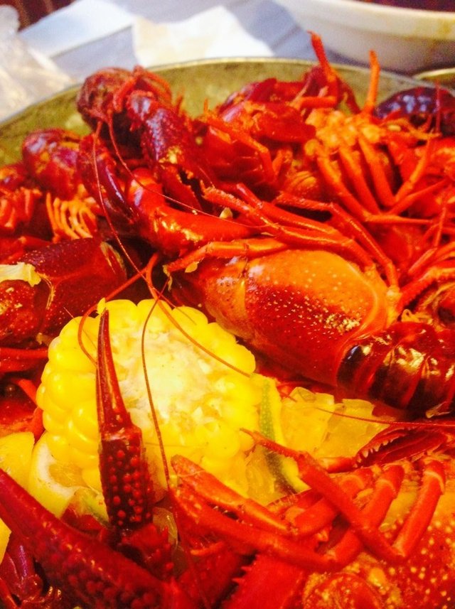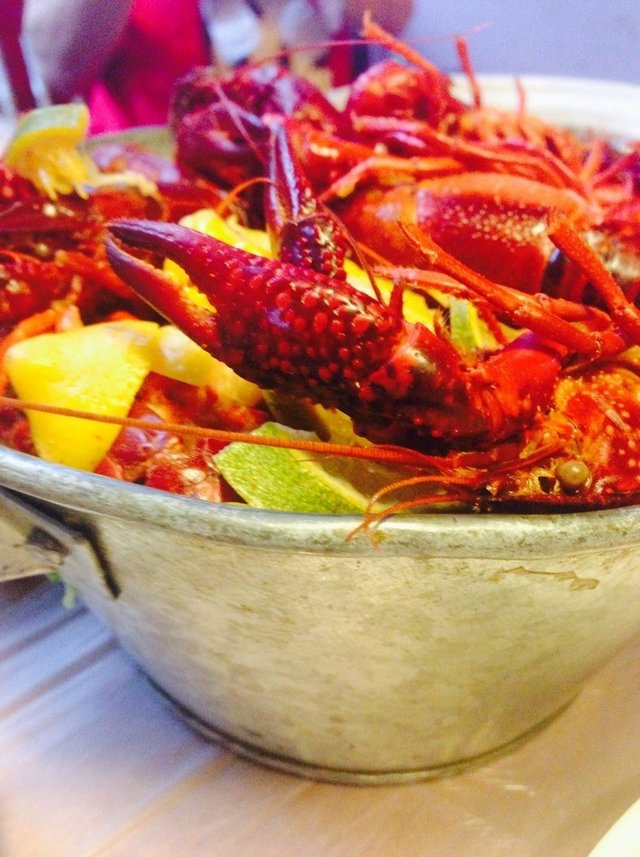 真的是铁桶装的啊,里面有柠檬,姜片什么的,大虾的个头很大比油门的大,而且是完整的一个,没有了作料的遮掩,铁桶小龙虾其实才能显现龙虾的品质。因为是原汁原味的龙虾肉,。所以给我们三种不同口味的蘸料,芥末味、双椒味(辣的)、辣醋味。重口味的我更喜欢双椒的,哈哈。其实不蘸也很好吃,虾肉很紧实,入口弹弹的,回甜,就是好难剥啊,大家一定要带双层一次性手套哦,为了美食,啥都能忍的是不?
