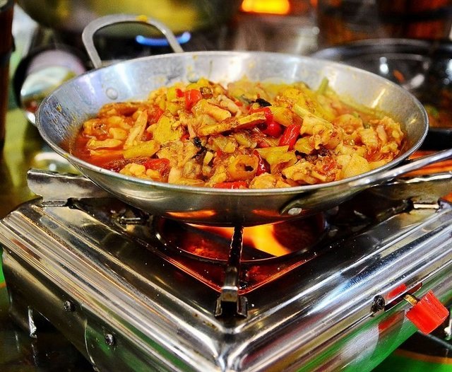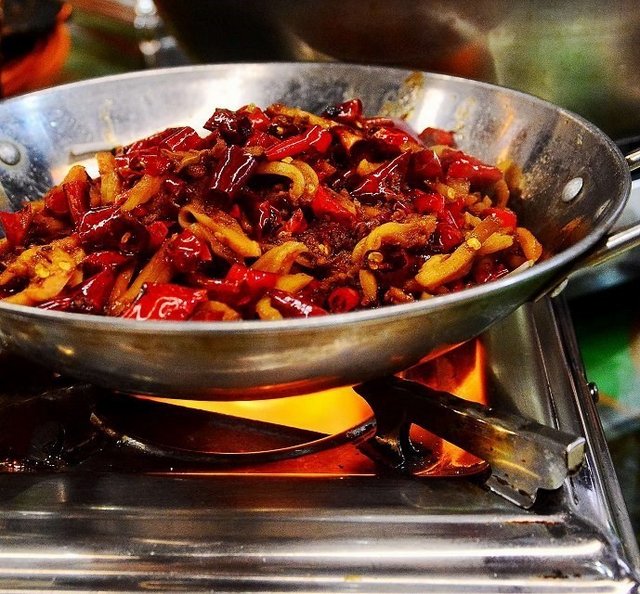 【口味牛蛙】放在火上煮,辣椒的味道完全融入牛蛙肉里,非常的鲜辣入味。其辣味的程度,可想而知,想知道的只能自已来体验了