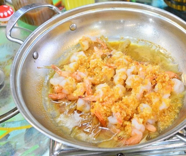【焖锅水晶虾】45元,刚上锅的时候虾子是活的,摆上餐桌用小火焖上几分钟再出锅,就可以品尝美味的水晶虾了,白嫩嫩的肉质,足以见得这虾子的鲜美。