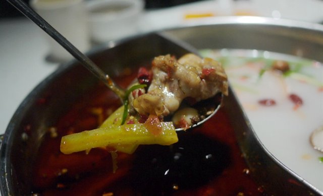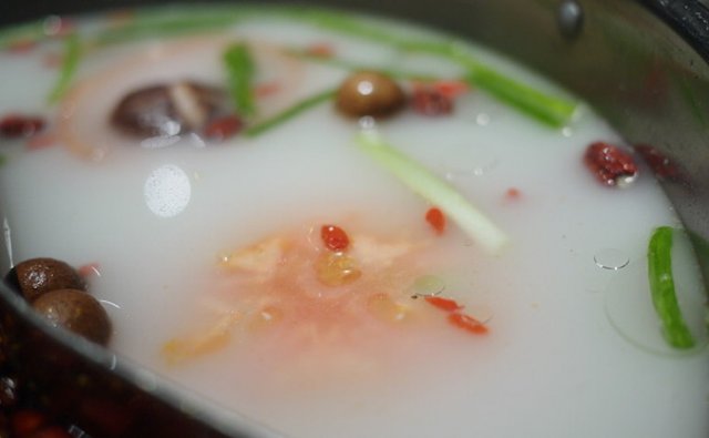 因为宠物有一个不吃辣,所以没点干锅,要了火锅,牛蛙锅,鸳鸯锅底,并且把点的牛蛙一样一半放到两个锅底里 ,锅底里除了牛蛙还有笋。辣锅满满的全是辣椒,服务员稍后会帮忙把辣椒捞出去,清汤锅有几颗柜员,还有香菇,还放了几片儿西红柿