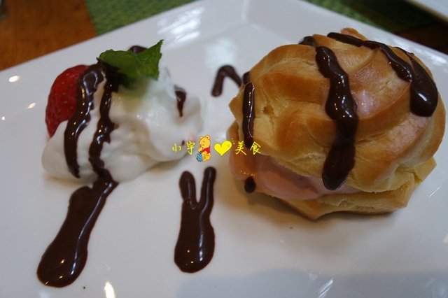 【冰激凌配巧克力汁】旁边的泡芙状的里面是草莓奶油,旁边的冰激凌也是相当甜,我都不知道这个怎能做出这样的啊