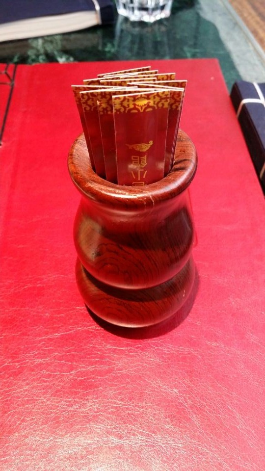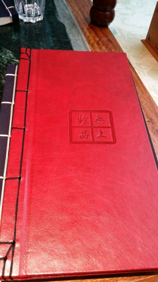 刚开始进去就坐,感觉环境不赖,房顶有很多的红灯笼,木制的椅子,还有类似武功秘籍的菜单,服务员穿着类似店小二似的衣服,别有一番风味。
