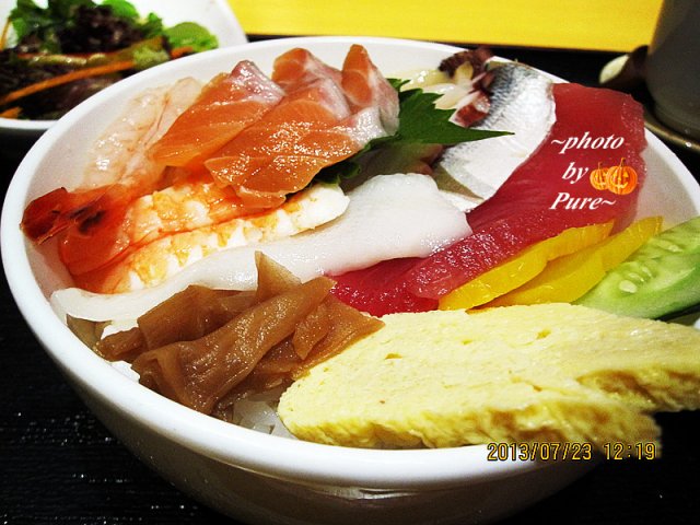 【合点mega盖饭】58元 这道里面是有甜虾,三文鱼三片,还有金枪鱼一片等若干刺身。不过都切很小块。58元一份。和小熊屋88元的海鲜饭套餐差远了啊。同样是海鲜饭,上面的内容有点单薄。MEGA一次口气很大。不过下面的饭是很多的。满满一碗饭。哪怕是男生来吃,这点饭保管你饱!只要就着酱油,wasabi,把饭吃光,再厉害的大胃王也够吃!饭的本身是带有微酸的鲜味的。米饭的质量不错。