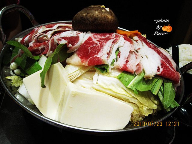 这款定食上来锅子很大哦。里面有牛肉,金针菇和各类蔬菜,配有生鸡蛋。不过朋友说她还是不放心国内的生鸡蛋质量,直接倒火锅里煮了。牛肉很鲜美。煮到后面很甜很鲜。是不错的寿喜锅。