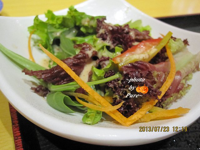 【色拉】里面有芝麻酱,味道不错哦。作为开胃菜酸酸甜甜的,还不错。