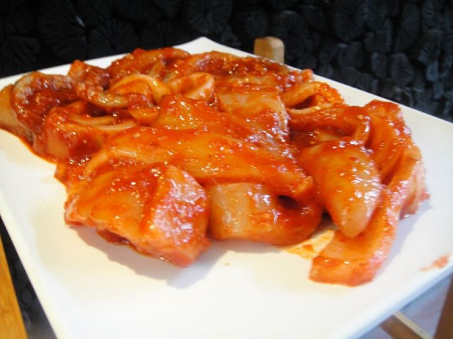 腌渍的鱿鱼,生的哦,一会烤好了会很入味,感觉就是韩式辣酱调的味