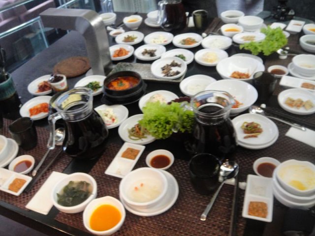 可爱之处是小菜免费续,可以吃到饱的哦,土豆泥沙拉、水果沙拉、醉蟹、牛肉汤、海带丝、南瓜羹、鸡蛋羹什么的都可以无限续,看看这是我们某一局的战况,当然超过6个人,店家也酌情上了多几份,不然一趟一趟折腾太费人力