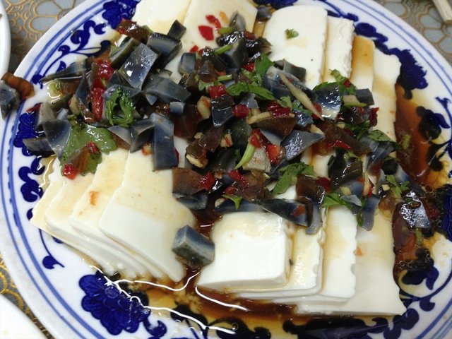 【皮蛋豆腐】10元。心里再次怨念…不过这量真是够大。虽说皮蛋不是溏心,但现在能上溏心皮蛋的忠厚商家真是不多见,装没看见吧……这道凉菜的味儿倒是够正,咸鲜口儿被发挥得淋漓尽致,有点儿小意外