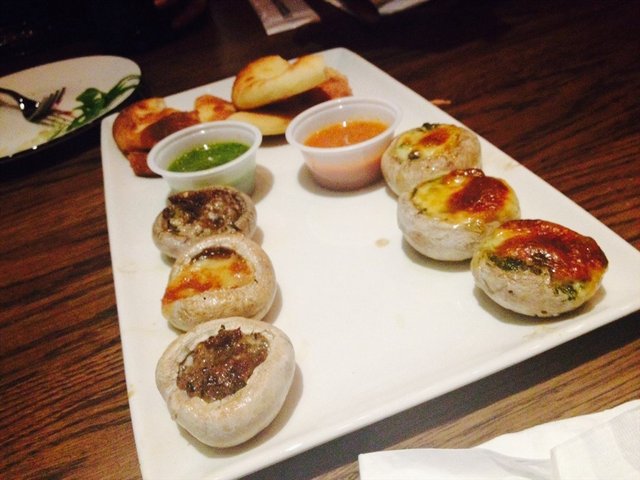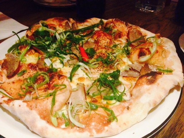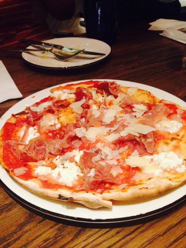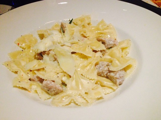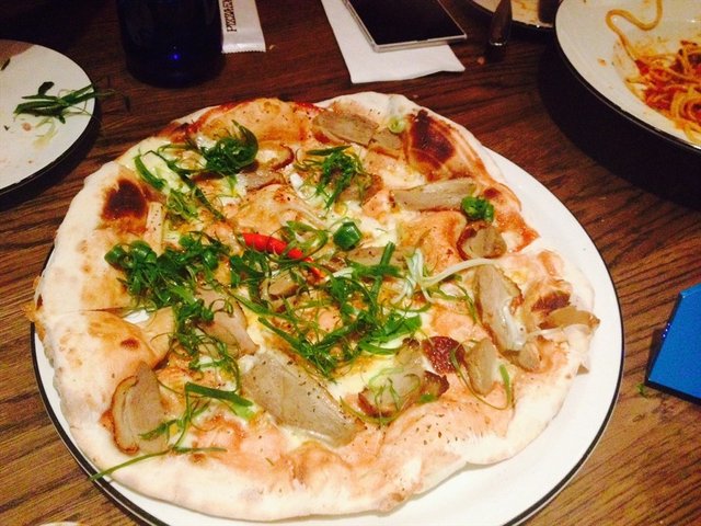 条纹对折日去的,穿着新的条纹连衣裙还有些小兴奋呢。6点不到就去排队了,小伙伴们要6点多、7点才能分别到齐,所以占位时东看西看,看到几乎所有人都穿条纹,连小宝宝都穿着条纹小体恤时觉得好可爱哦~。等生日的主人公出现,我们就把点评上比较人气的品种比如,三文鱼、烤鸭披萨,等都点起来,最后觉得还是烤鸭披萨最好吃,所以又加了一份。焗蘑菇味道不够浓,三文鱼很新鲜,海鲜意面不太好吃,蝴蝶奶油肉丸面还不错,帕尔马火腿披萨也一般,有火腿的地方很咸,没火腿的地方就淡,最后结账才300多,打对折太好。希望经常搞活动哦,哈哈
