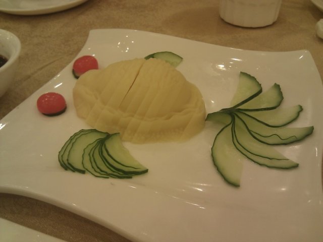 素鲍鱼:素鲍鱼呈淡黄色,吃起来软软酥酥的,好似豆制品,清脆的黄瓜,都很好吃。像条鱼在水里游,尾巴是黄瓜,眼睛是小番茄,身体是鲍鱼的形状。