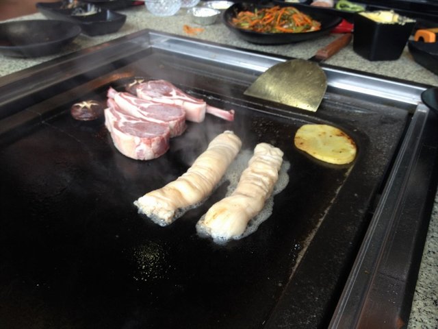 第一种是和第二种都是这里大厨秘制的调料,第一种类似辣酱,但是又不是特别辣,这个用来生菜包肉放最好;第二种,这个味道蛮特别的,绝对是一般其他家吃不到的,这个配着香肠还有地瓜片等干物吃比较赞;第三种就是大家常见的黑胡椒海盐了,手动自动研磨的,可见调料品种,这个当然是配着原味烧肉最好吃了