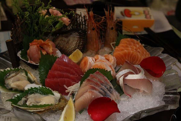 第一道菜是刺身,8个人2盘~看到我直流口水~除了有三文鱼、三文鱼腩、章红鱼、章红鱼腩、吞拿鱼、牡丹虾、活赤贝刺身,还有生蚝~