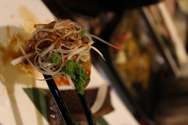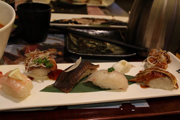 第七道是杂锦寿司,每个寿司造型都很不错~甜虾寿司很鲜甜,小小的柠檬片使整块寿司增色不少;鹅肝寿司第一次吃,鹅肝上有很多葱丝,盖住了鹅肝本身的腥味,浓浓的酱汁,肝味浓郁。