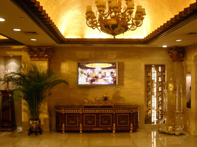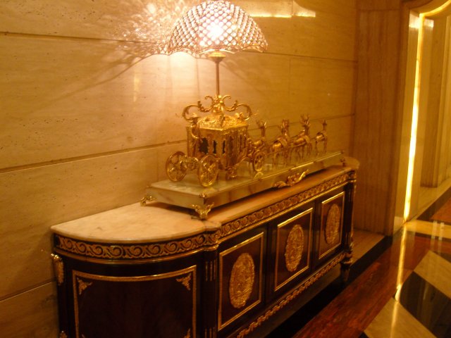 王朝大酒店果然一派王朝气势,不消说店堂的金碧辉煌,就连店里到处摆设的各种精美的摆设,就更让我看的眼花缭乱了。几乎是每隔两步的墙边就会有一个装饰性的摆设,当然,这些摆设不是华贵无比就是艺术感极强的。