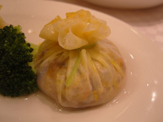蟹黄石榴鸡的造型就像是皮子很薄的烧麦,顶端点缀着一些蟹黄,里面包裹着的是香菇、火腿、鸡肉、胡萝卜, 荸荠, 洋葱等等切丁混合的馅料,不知道是不是因为外皮是蛋清做的缘故,虽然里面的配料那么多,但是吃起来的感觉还是很清淡的。