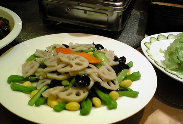荷塘月色:是百果黄瓜和莲藕以及胡萝卜做的青菜,名字起的很文雅,卖相也不错,配合着肉菜吃,很爽口。