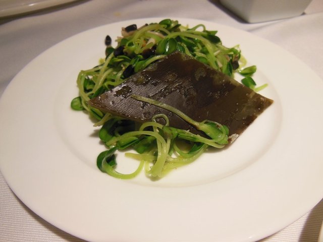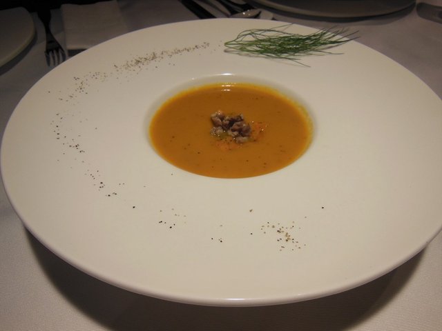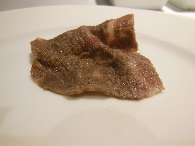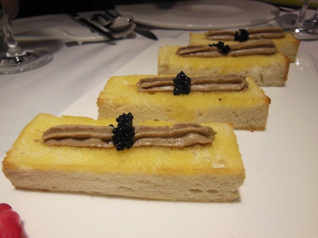 我没有将鹅肝在面包上抹平,而是直接入口,这样更能感受到柔嫩的鹅肝在口中融化的过程,细小的黑鱼子腥味很淡,它的的鲜咸口感就像一股激流,在微甜的面包和鹅肝中异军突起,却并不突兀,让我觉得十分美妙,不由得对下面的菜式期待起来。