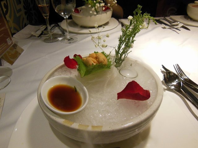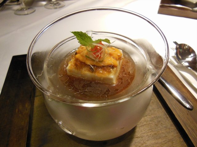 在两道前菜中,我比较青睐这道带海胆的腐胆。海胆下,垫底的是内酯豆腐在酱料的浸染下,在细嫩中带着一抹咸酸,果然开胃。