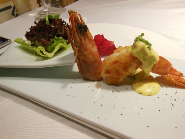 这道搭配着黄色酱料的大明虾,叫做龙洞。虾肉的肉质很紧实,酱料是用十几种植物香料调配的,味道接近蛋黄色拉酱。