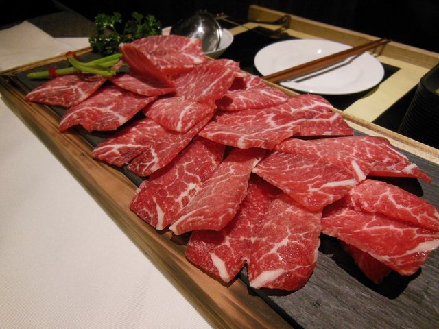 极品手切雪花牛肉有着大理石般的纹路,在锅里煮到7分熟,肉质柔嫩,搭配店家提供的芝麻酱或者是酱油碟,都很美味。