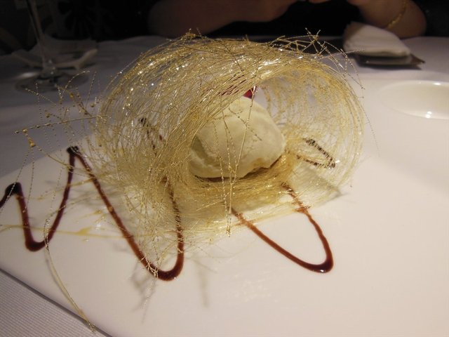金缕衣,甜品推荐这道金缕衣,拉丝的焦糖做成的圆巢下,是口感滑嫩的香草冰激凌,冰激凌下垫底的是切片的柿饼。