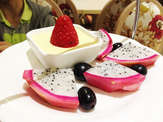 芒果流心 上面一个很大的草莓,一勺下去,芒果酱就流了出来,非常好吃,芒果特有香气,滑溜的口感,超赞