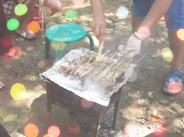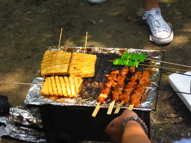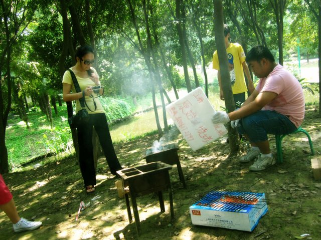 很快抵达了烧烤区,我们开始铺桌布,架烤架。一切都不算熟练,但还算顺利。