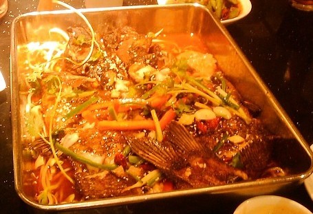 原本想点大家推荐的楚炫堂烤鱼,结果却被告知刚刚卖完,郁闷中~于是服务小姐便向我们推荐起了自助鱼火锅(鱼加锅底,可选鱼拼盘)和厨师炖鱼(这种烹饪法主要是喝汤,鱼肉炖好后会缩水)。正在犹豫选哪个,看到有个紫苏清江香鲶貌似也还不错,于是就要它了,选了红汤。经服务小姐介绍说,这个可以再点些涮品放里面,于是就另点了个豆类拼盘和一份娃娃菜。这鱼的肉质很嫩,很厚实,美味啊~汤里料还挺多,豆类和娃娃菜放在红汤里涮过后,其实不沾调料就可以直接吃了,非常入味。