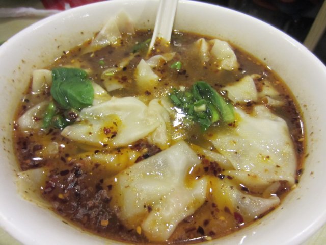 大概等了半个小时,才坐到店里。要了一碗红油抄手,一个大肠面。