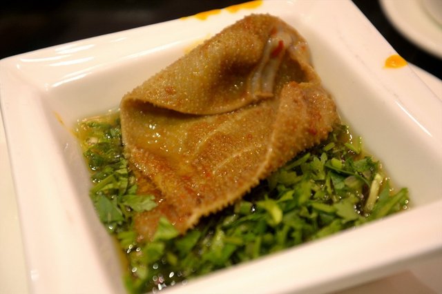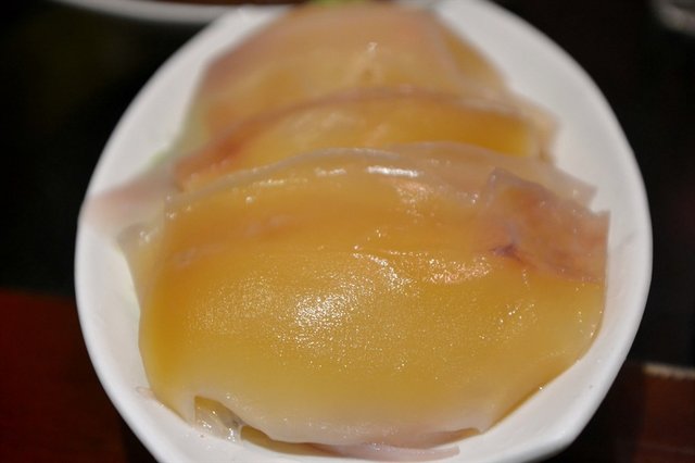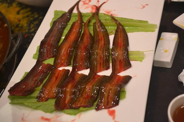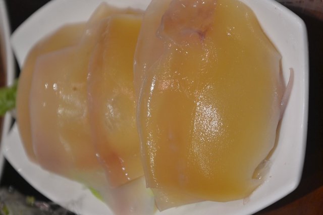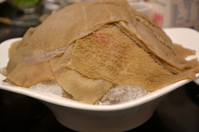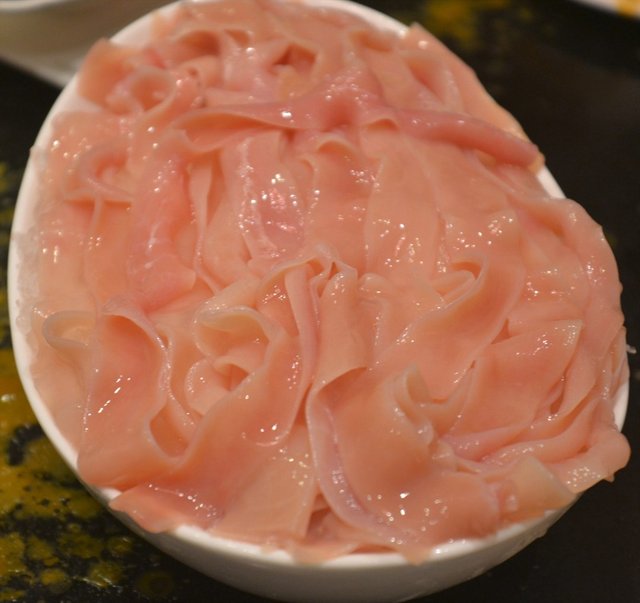 有两种颜色的毛肚,绿草个人比较喜欢吃浅色的,口感比较细密,薄薄一片,很快就烫好了