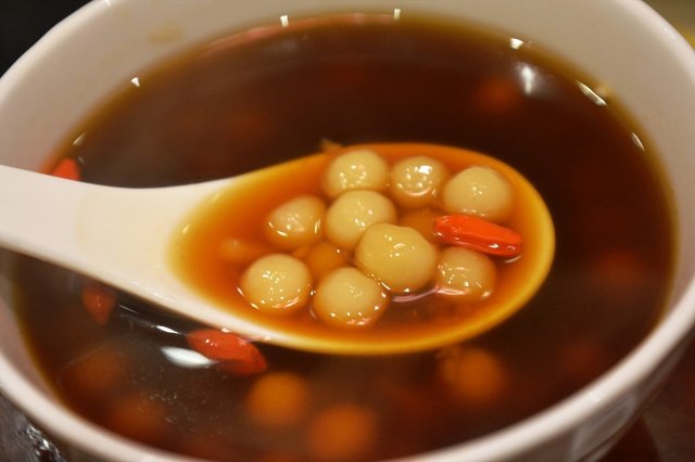 这个醪糟小汤圆端上来,绿草激动的哭了~因为那天绿草亲戚来了,这个小汤圆的汤汁竟然是用红糖水熬制的,还比较浓,简直太贴心了