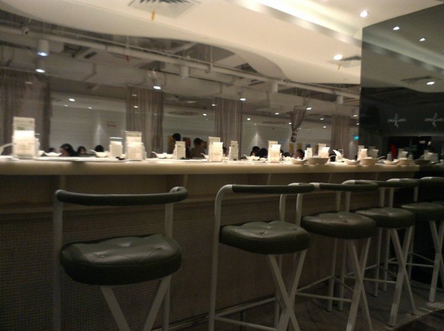 坐电梯直上5楼,电梯门外就是他家的前台,右侧他家的就餐大厅里,左边是多人位置的就餐台子,右侧是双人就餐台,而中间,则是一圈单人就餐吧台,就餐空间很宽敞。餐厅的墙壁上,描绘着绿色的像枝条一样的图画,看起来既清新又舒服,不过店里放着的则是那种动感很强烈的音乐,我不是很喜欢。
