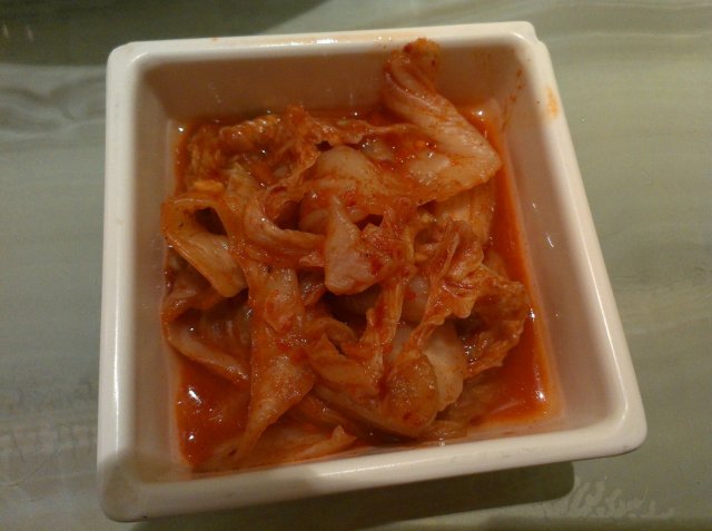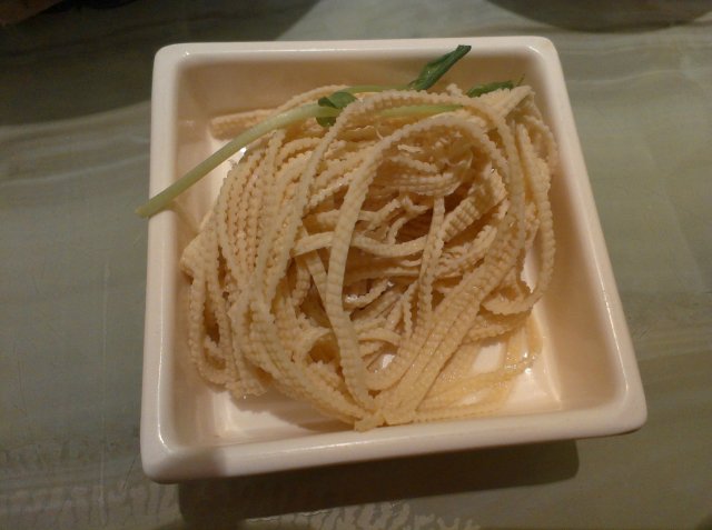 同样在酱料台子上,还有辣白菜和干丝两种小菜免费自取,辣白菜的味道爽脆的,干丝则有些平淡,后来我把这个干丝倒入到火锅中,却发现这干丝还是适合待在火锅里,被烫过的干丝嫩嫩的,很容易就吸收了汤里的鲜味,我觉得很不错。