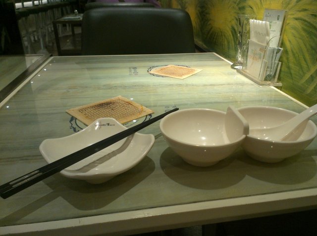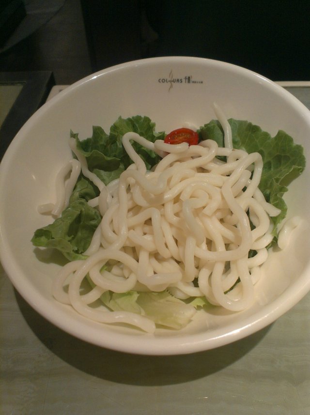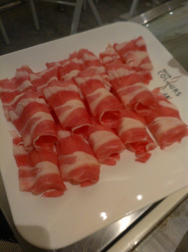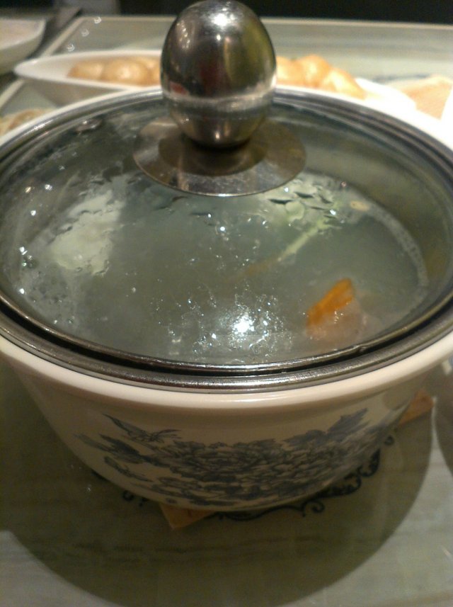 因为套餐里已经有金针菇,所以我就没有选择菌王锅,在骨汤锅和昆布锅两者之间犹豫,听到店员跟我说骨汤锅里有块排骨,我就毫不犹豫的选择了骨汤锅。看到他家的汤锅,不知道为什么,我一个想到的是冬瓜盅。不过这种好像是青花瓷似的汤锅,让我觉得挺特别的,但是因为炉灶是在桌子里面的,所以让锅面也变的有些低了,锅里面的汤汁在烧开的时候经常会溅出来,我的t恤上就被溅上了好几滴汤汁。千彩的锅底,据说是以养生为主,所以味道都不是那么的浓烈,像这个骨汤锅,味道就很淡,而且烫到后面的时候,是越来越淡。里面也的确有块排骨,个头还挺大的,不过同样味道淡。