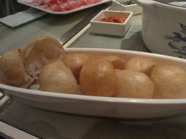 油面筋鱼滑。这个鱼滑是被嵌在切开的油面筋里的,不厚道的说,这是两个涮菜了。鱼滑挺劲道的,不过每个油面筋里被塞的鱼滑深浅不一。