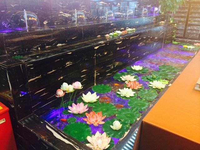 最喜欢的座位,旁边有一个小水池环绕,水池里面还有荷花,座椅的图案也非常出彩。