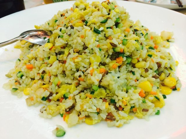 扬州炒饭:扬州炒饭应该是快餐店都能见到的品种,这回吃到的无非是豪华版的,里面有虾仁、玉米、胡萝卜、黄瓜粒、鸡蛋等,吃起来也是一个字:鲜